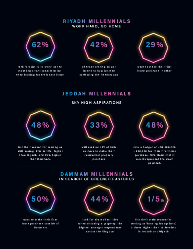 The results of Survey 1 have allowed us a unique insight into the home ownership aspirations of this all-important group of Saudi’s. 30% of our survey’s respondents were under the age of 35. The results highlight a growing gap between generational priorities, with a drop in traditional values, such as privacy, and a growing preference for community living amongst millennials. The survey results reveal different stories for each of the three featured cities. The results in Riyadh reflect the effects of domestic migration, while in Jeddah affordability issues are prevalent. Elsewhere, in Dammam, our findings point to an undersupply of property purchase options.