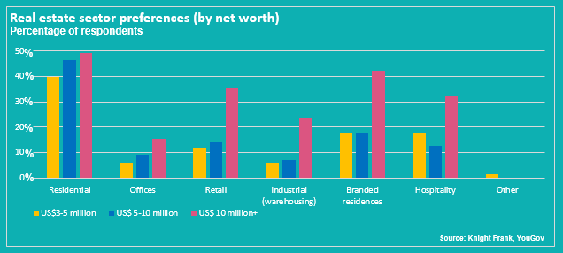 The attraction of the residential sector also rises with net worth. For instance, those with a personal value of more than US$ 10 million favour the residential sector (49%) and branded residential sector (42%) the most.