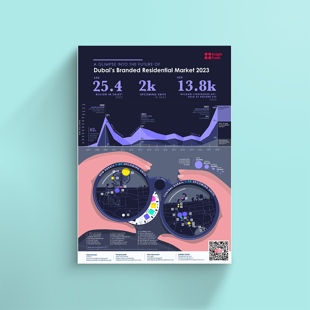 Branded residences are a growing trend in Dubai's real estate market. The infographic highlights the significant increase in sales for branded residences, with over 25 billion AED in sales made to date. This represents an 80% year-on-year increase and a new sales record for the market.