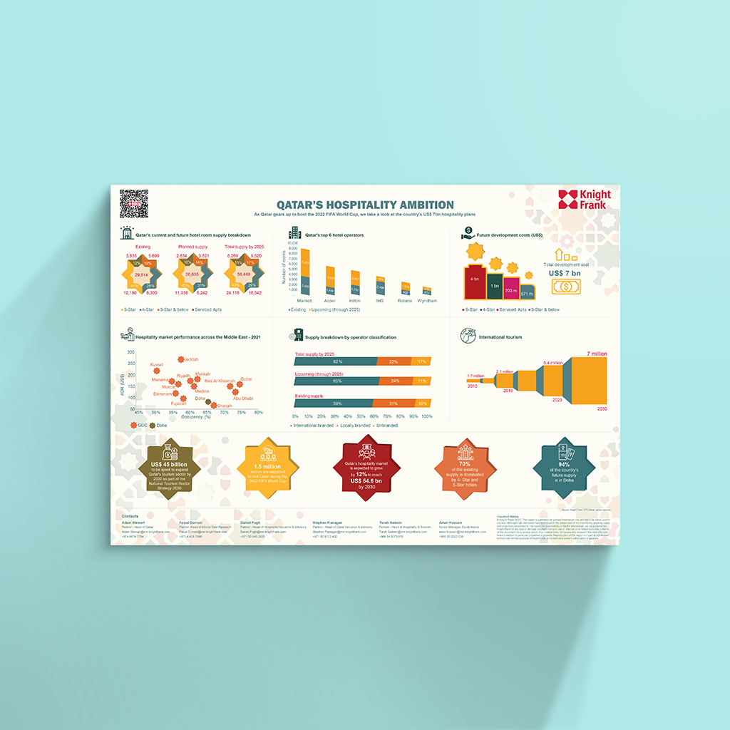 Explore our research infographic showcasing the Qatar’s hospitality sector. Discover key insights room supply categorised by star rating, delve into the top 6 hotel operators in Qatar, and get a comprehensive view of the existing supply, under construction projects, and final planning supply.