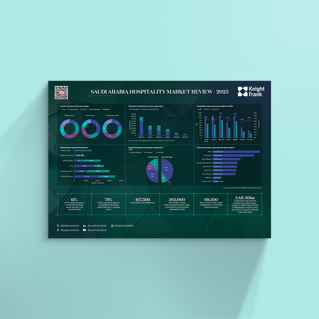An annual infographic offers a snapshot of Saudi Arabia’s hospitality and religious tourism market, covering ADR, occupancy, RevPAR, and the pipeline of upcoming projects.